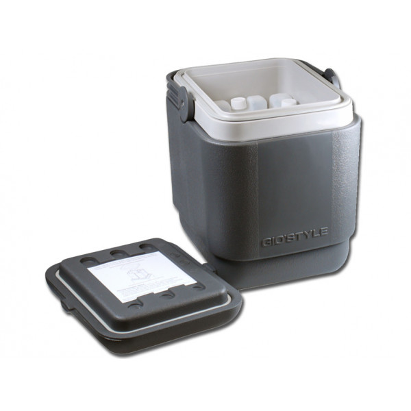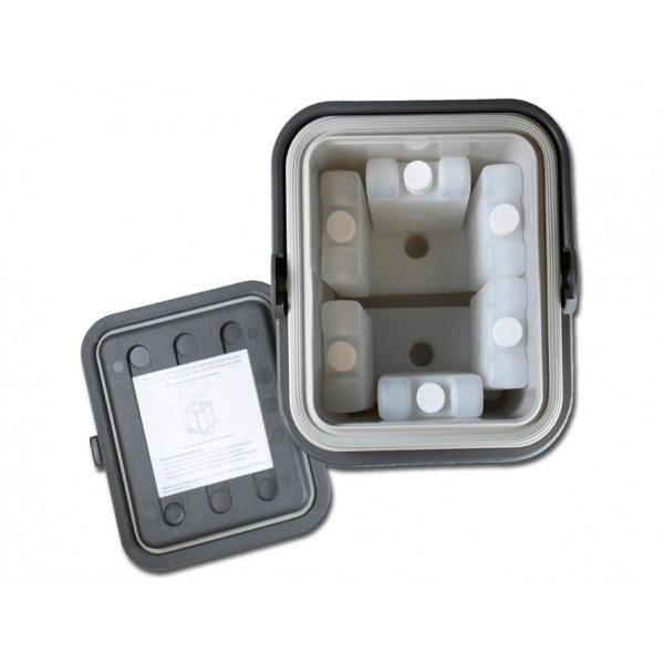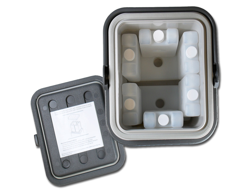 - Composto da 8 contenitori porta ghiaccio da 400 ml che mantengono il vaccino freddo per 40 ore, ad una temperatura di 8° con temperatura esterna di 43°C (in assenza di apertura).