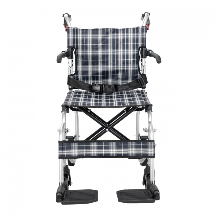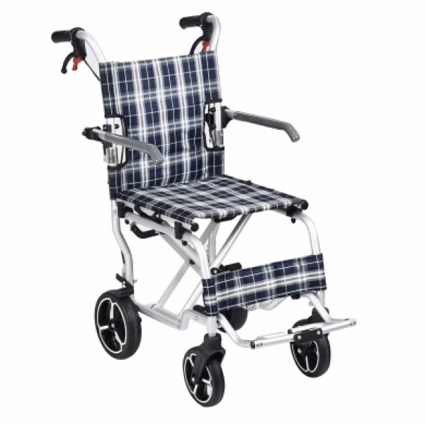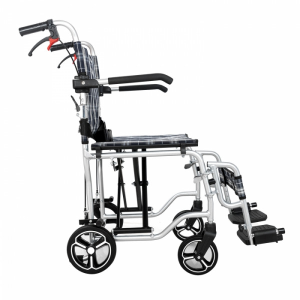 Carrozzina da trasporto in alluminio con telaio pieghevole a crociera e schienale abbattibile, per ridurre gli ingombri. Dotata di braccioli ribaltabili rivestiti in materiale plastico, poggia piedi singolo ribaltabile con fascia poggia polpacci, freni per accompagnatore sulle manopole di spinta e due maniglie per il trasporto piegata.