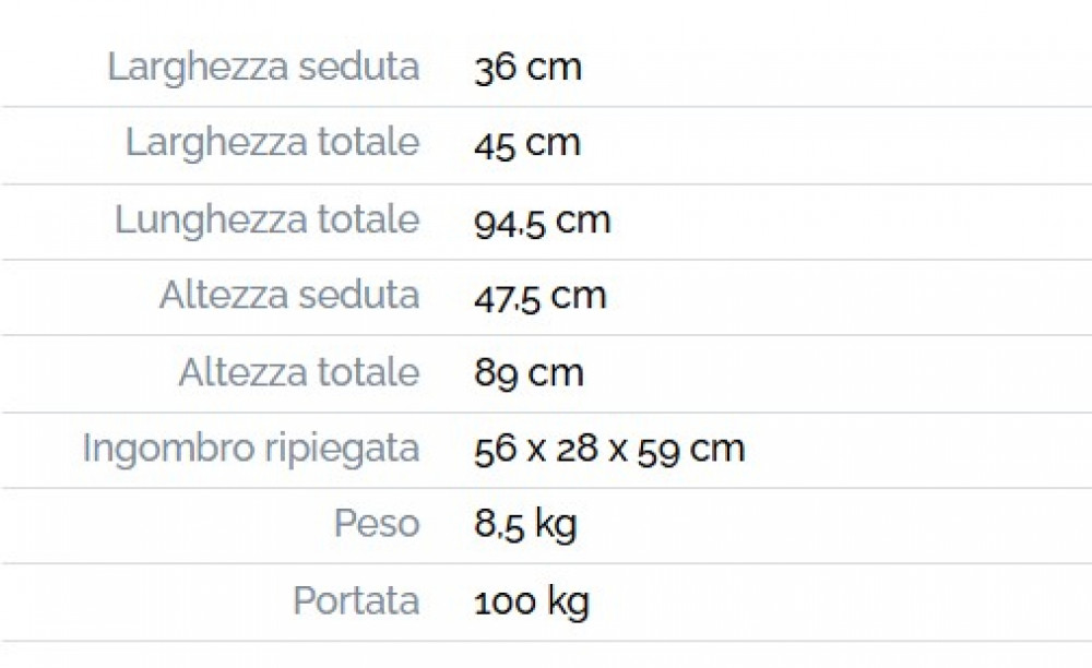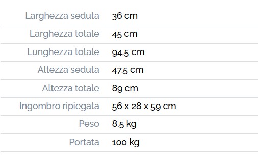 Carrozzina da trasporto in alluminio con telaio pieghevole a crociera e schienale abbattibile, per ridurre gli ingombri. Portata massima 100 kg.