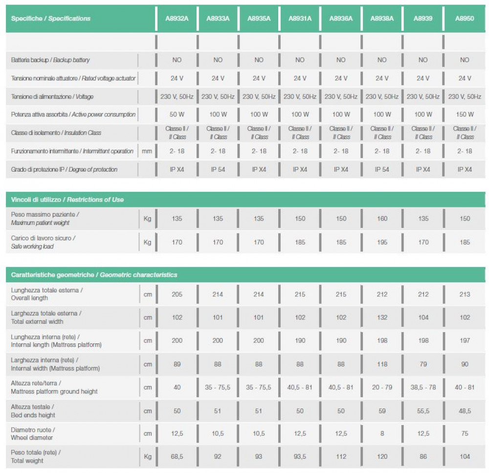 - Telaio rete - Struttura portante perimetrale esterna costruita in profili di acciaio a sezione rettangolare. Telaio sezioni mobili realizzato in tubo di acciaio a sezione ovale. Piano rete in doghe di acciaio. Guide reggimaterasso. Dotato di due supporti per asta sollevamalato e asta porta flebo. Piano rete a 4 sezioni.