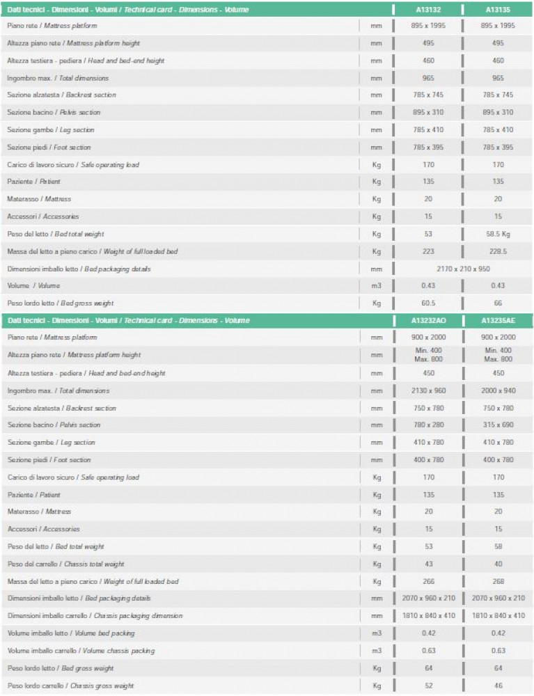 Letto a 3 snodi, 4 sezioni. Carrello altezza variabile oleodinamica.