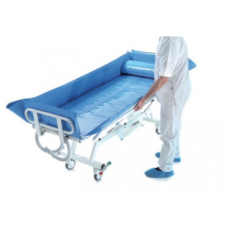 Barella doccia per il lavaggio ed il trasferimento di pazienti, elevabile idraulicamente da 65 a 91 cm, con piano di lavaggio inclinabile tramite molla a gas fino a 5° per un corretto drenaggio durante e dopo l’uso. Struttura in acciaio verniciato a polveri, con trattamento antiruggine di derivazione automotive per garantire affidabilità e durata nel tempo. Telo imbottito in PVC rinforzato con poliestere, privo di ftalati, sanificabile. Le ruote ad alto scorrimento, Ø 125 mm, sono dotate di freno a blocco totale. La larghezza contenuta della barella consente una facile movimentazione senza sforzi anche in spazi ristretti. Dotata di sponde ribaltabili di 180° per consentire un facile posizionamento del paziente sulla barella direttamente dal letto e viceversa.