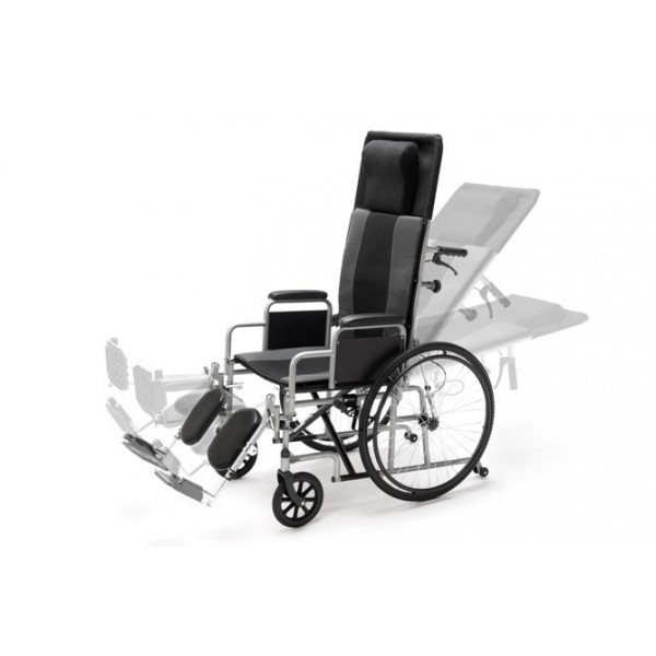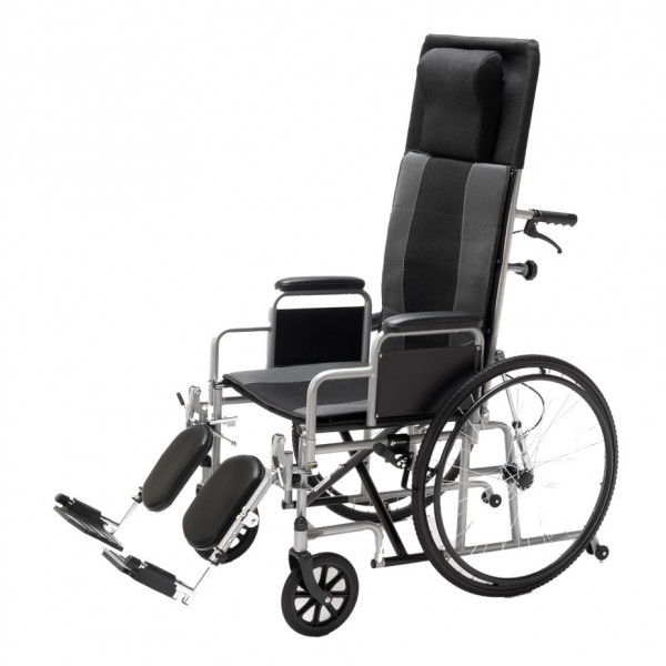 - Carrozzina pieghevole con poggiatesta, schienale reclinabile e pedane elevabili.