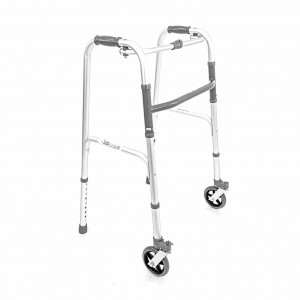 Struttura in alluminio anodizzato regolabile in altezza mediante bottoni a pressione. Un pulsante consente di ripiegare facilmente il deambulatore. Ruote anteriori grandi piroettanti di diametro cm. 12,7 con blocco direzionale opzionale e puntali antiscivolo in gomma con rondella metallica interna. Grazie a questo optional è possibile scegliere se mantenere la ruota piroettante oppure fissa.
