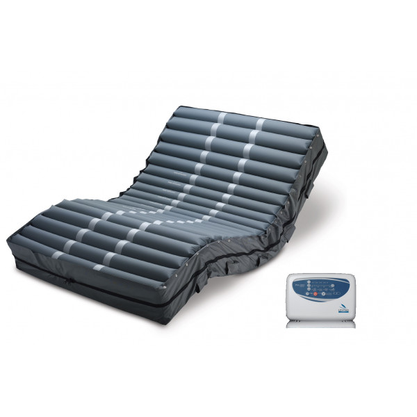 Indicato per la prevenzione ed il trattamento delle piaghe da decubito fino al IV STADIO. L’altezza degli elementi permette di utilizzare il materasso senza l’utilizzo di un materasso aggiuntivo. Funzionamento alternato a 2 vie. Le celle sono realizzate con la tecnica del “CELL-IN-CELL” (la parte inferiore serve da supporto anche in caso di mancanza di corrente) e una particolare forma rettangolare “QUBICELL” che consente maggior comfort dovuto ad una miglior dispersione dei punti di contatto. Completo di coperta stretch in poliestere/PU traspirante, impermeabile, trattata agli ioni d’argento, fissata per mezzo di zip, può essere fissato al letto tramite cinghie in dotazione ed è dotato di occhielli passacavo. Compressore digitale permette di impostare peso del paziente e tempo del ciclo, dotato di allarme visivo e sonoro per bassa pressione, mancanza di alimentazione/ manutenzione e filtro aria intercambiabile. Connessione materasso/compressore tramite connettori veloci dotati di chiusura, utilizzabile in caso ditrasporto del paziente.