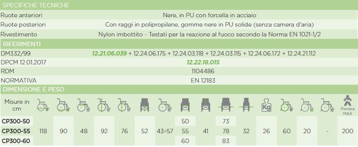 Telaio stabilizzante in acciaio verniciato DOPPIA crociera, seduta e schienale in nylon nero imbottito e lavabile, tasca portadocumenti sul retro. Ruote posteriori piene (Ø 60 cm), gomme nere in PU. Ruote anteriori nere in PU (Ø 20 cm – spessore 5 cm) con forcella in acciaio con fori per la regolazione della ruota. Braccioli corti estraibili con imbottitura in PU. Pedane estraibili regolabili in lunghezza con pedana in plastica nera e cinturino ferma-tallone.