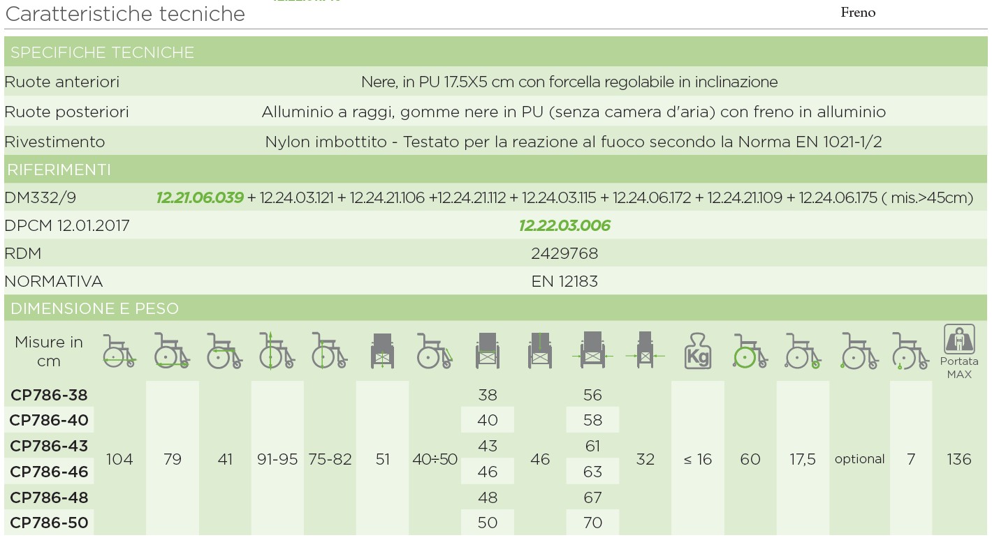Telaio in alluminio leggero pieghevole con doppia crociera e braccioli semi-lunghi ribaltabili, estraibili ed elevabili, morbidi in PU. Schienale tensionabile in 5 punti con cuscino imbottito e tasca portadocumenti posteriore. Ruote posteriori in alluminio a raggi con corrimano, gomme nere in PU, perno regolabile in 3 posizioni, sgancio rapido e freno in alluminio. Ruote anteriori nere in PU con forcella in plastica regolabile in inclinazione. Dotata di ruote per passaggi stretti/ascensore e pedane ribaltabili, estraibili e regolabili in lunghezza, con cinturini ferma tallone e poggiapiedi in nylon regolabili in inclinazione.