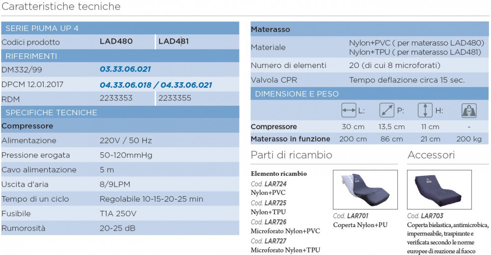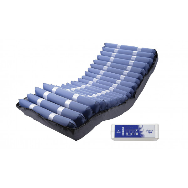 Indicato per la prevenzione delle piaghe da decubito fino al IV STADIO. I primi quattro elementi a funzionamento statico con funzione cuscino per la testa; la restante parte è divisa in 2 sezioni a funzionamento alternato a 2 vie; completo di coperta imbottita in Nylon/PU biocompatibile, impermeabile, traspirante, verificata secondo le norme europee di reazione al fuoco e dotata di zip su tutti e quattro i lati per una facile rimozione e pulizia. Fissaggio del materasso al letto tramite cinghie in dotazione e dotato di occhielli passacavo. L’altezza degli elementi permette di utilizzare il materasso senza l’utilizzo di un materasso aggiuntivo. Gli elementi sono realizzati con la tecnica CELL-ON-CELL che divide la sezione in due moduli singoli dei quali quello inferiore rimane costantemente gonfio in modo da evitare un eccessivo effetto BOTTOM-OUT (sprofondamento), e garantire una sicurezza in caso di mancanza di corrente. Il compressore digitale è dotato di regolazione di pressione e di durata del ciclo, allarme visivo e sonoro per la bassa pressione e filtro aria intercambiabile. La funzione STATIC blocca il sistema alternato e lo rende di fatto un normale materasso. Connessione materasso/compressore tramite connettori veloci con chiusura, utilizzabile in caso di trasporto del paziente.