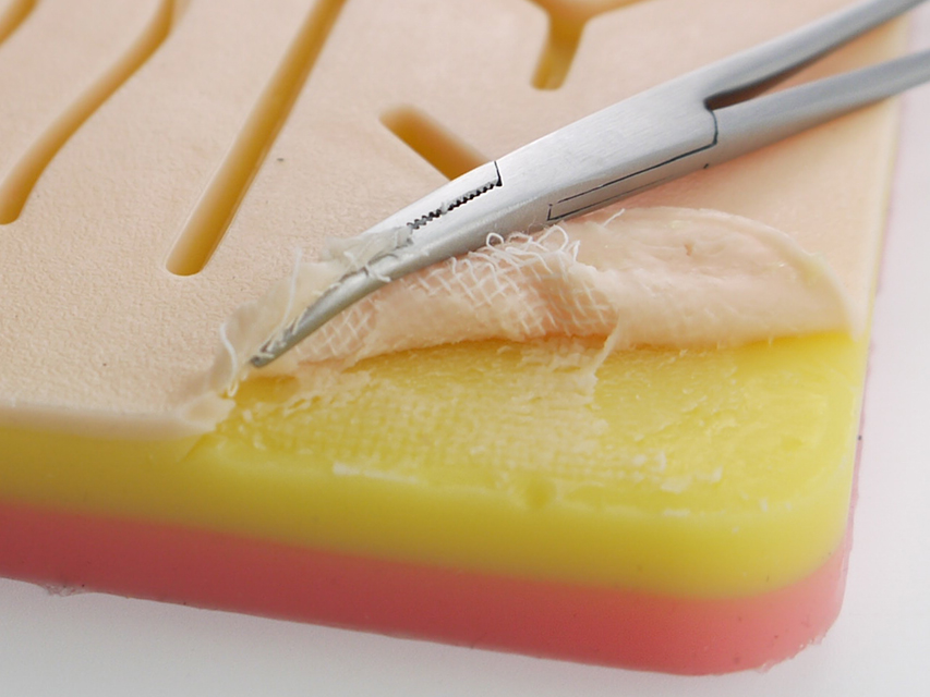 Cuscino simulatore per suture in silicone, con 14 ferite.