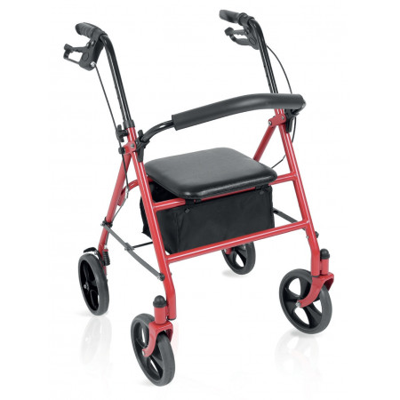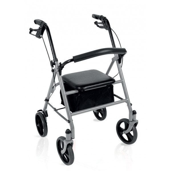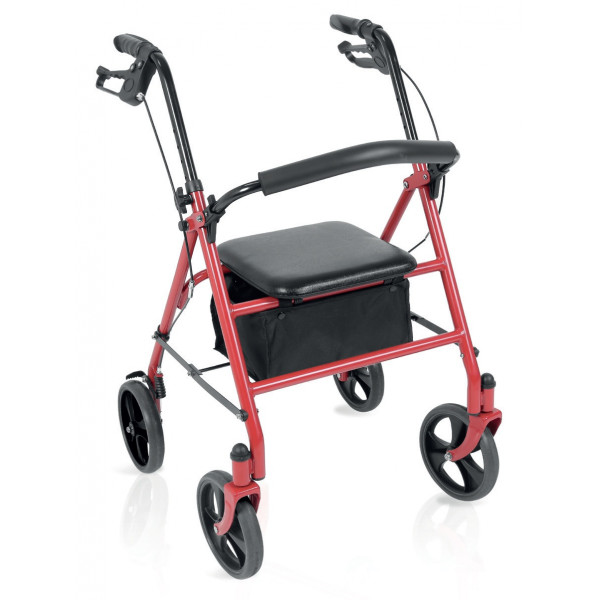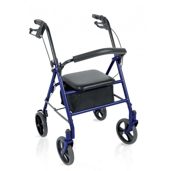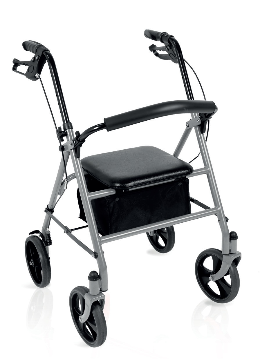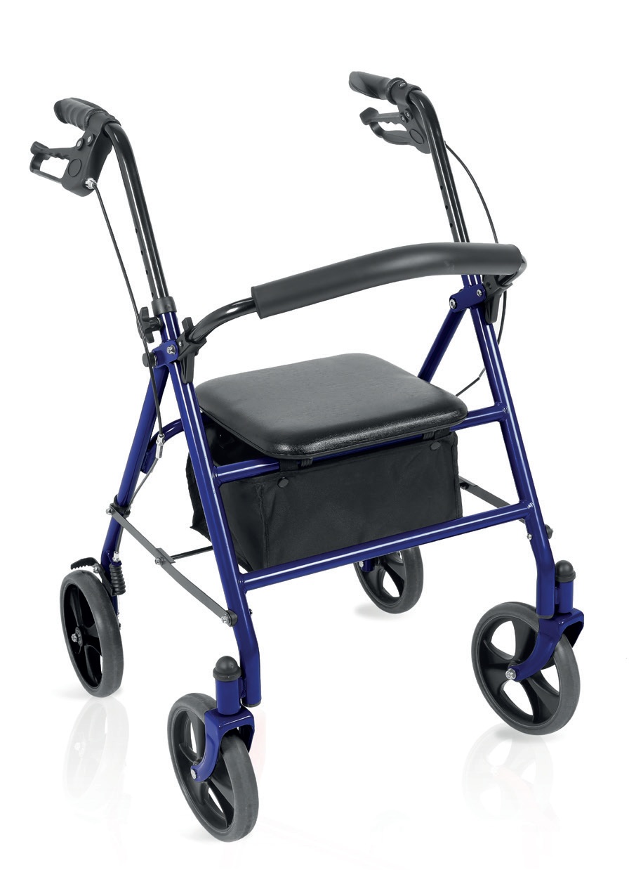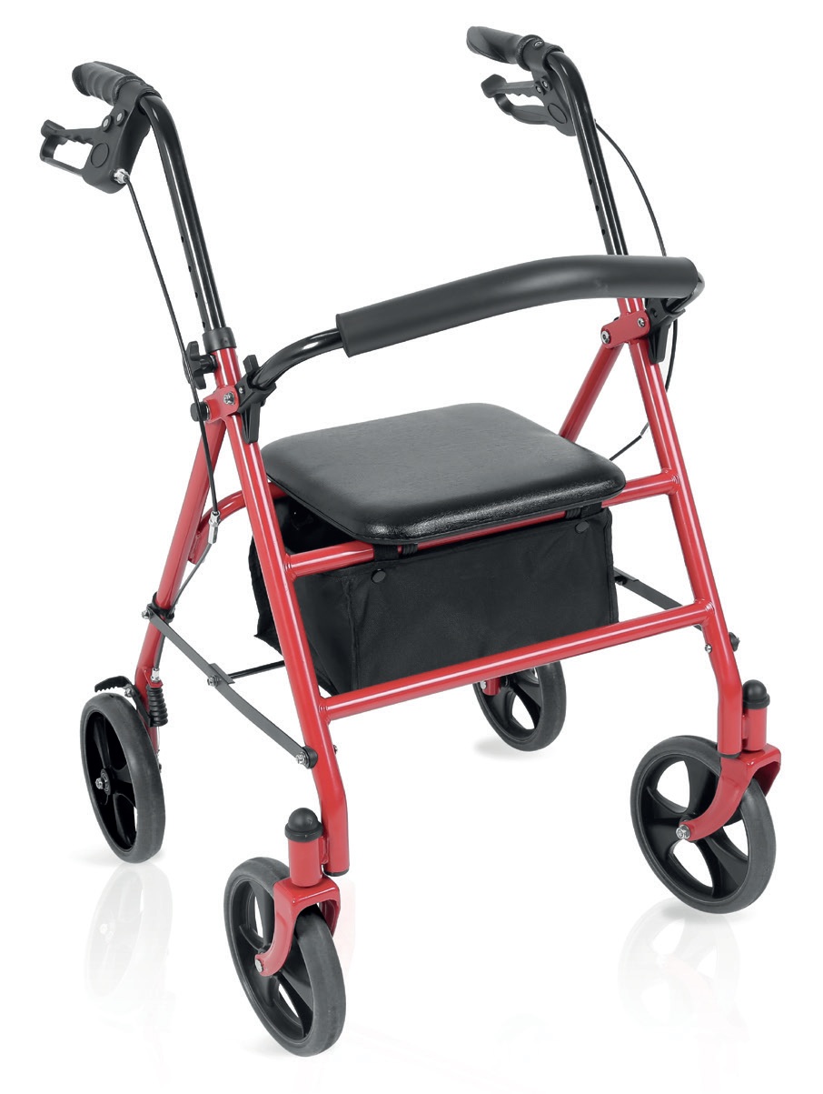 Rollator pieghevole in tubo di acciaio verniciato. 4 ruote piene di Ø 20 cm. Ruote frontali piroettanti, ruote posteriori fisse. Dotato di freni sulle ruote posteriori a doppia funzione. Impugnature anatomiche regolabili in altezza per il massimo comfort. Facilmente pieghevole per essere riposto e trasportato. Schienale imbottito ribaltabile ed estraibile. Fornito con sedile imbottito, e bista porta oggetti in tessuto.