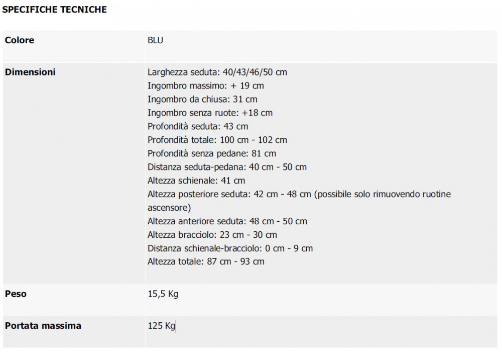 - Altezza posteriore seduta: 42 cm - 48 cm (possibile solo rimuovendo ruotine ascensore)