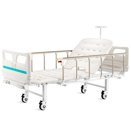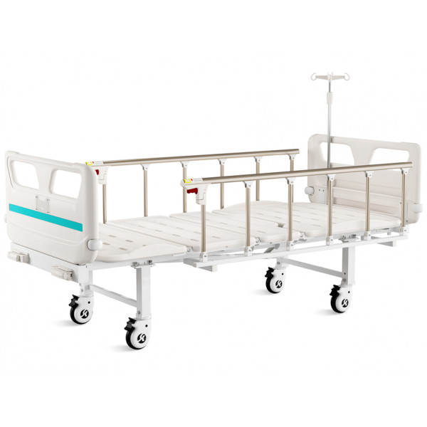 Letti ospedalieri manuali con 3 snodi regolabili mediante 2 manovelle. Testiera e pediera in PP dotate di rotelle ammortizzatrici Ø 65 mm, per evitare collisioni. Piattaforma materasso in PP suddivisa in 4 sezioni con fissaggio materasso integrato. Parti in plastica e verniciatura epossidica.