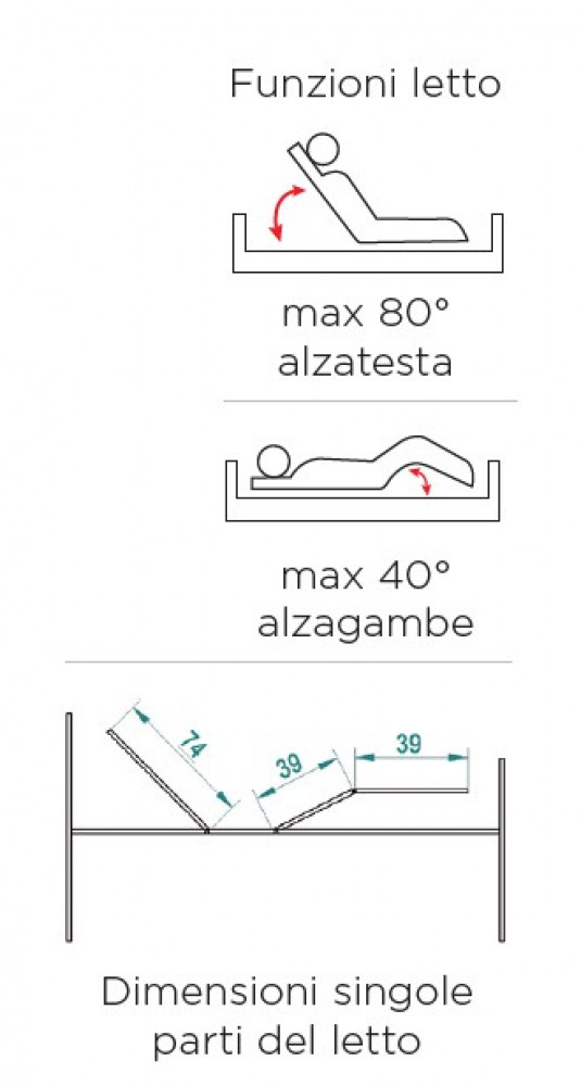 Leggi i requisiti per l'IVA agevolata.Letto a 2 manovelle e quattro sezioni. Struttura in tubolare di acciaio, verniciato a polveri con rete di acciaio elettrosaldata, adatta ad alloggiare qualsiasi tipo di materasso. Portata massima 135 kg.