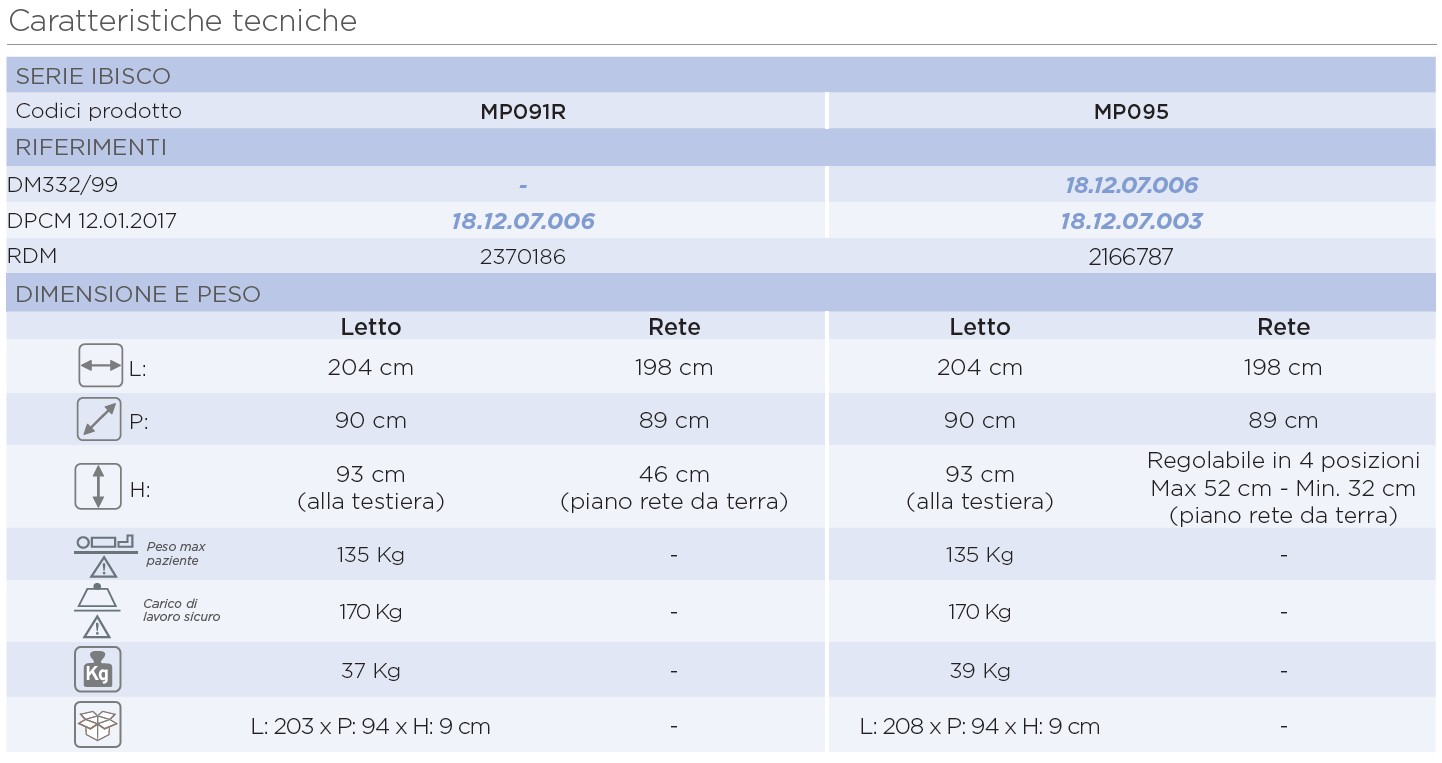 Struttura in tubolare di acciaio 4×2 cm, verniciato a polveri, rete in acciaio elettrosaldata, adatta ad alloggiare qualsiasi tipo di materasso. Testata e pediera in acciaio verniciato a polveri di facile assemblaggio grazie agli attacchi a baionetta. Pannelli molto robusti in MDF nobilitato da 11 mm. Conforme alla norma UNI CEI EN 60601-2-52 dei letti medici.