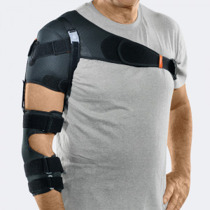 Ortesi funzionale di spalla per la contenzione dell'articolazione gleno-omerale. Struttura in tessuto traspirante 3D con supporto braccio regolabile. Supporto gomito con inserti in silicone e con tiranti elastici per la trazione verso l’alto del braccio. Tiranti elastici per la regolazione/fissaggio della spalla in intra/extra rotazione.